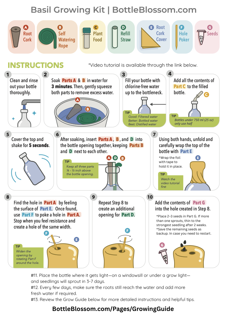 Transform a simple bottle into a thriving mini-garden with the Basil Kit from Bottle Blossom. This user-friendly, set & forget (passive) hydroponic kit allows you to grow fragrant, fresh, and nutritional basil right on your windowsill, countertop, or desk—no soil and no mess! Enjoy vibrant basil powered by light, water, nutrients, and minimal care.